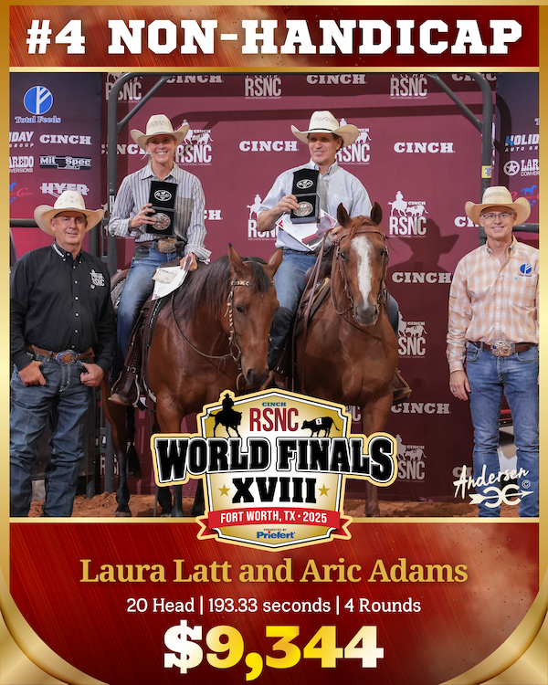 For Laura Latt and Aric Adams, the stars aligned as they sorted 20 head through four rounds in 193.33 seconds, earning them the #4 Non-Handicap World Championship and a $9,344 paycheck.